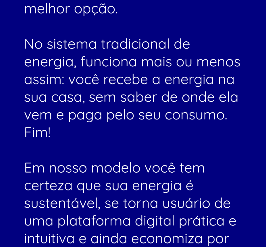 Fornecemos o essencial: sua energia. Através de uma experiência única e sustentável, nossa comunidade vai contra um sistema arcaico e burocrático, pensa no planeta e, de quebra, economiza.